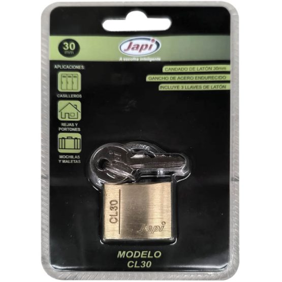 Candado de Latón 30 mm, 3 Llaves, Gancho Endurecido Blister
