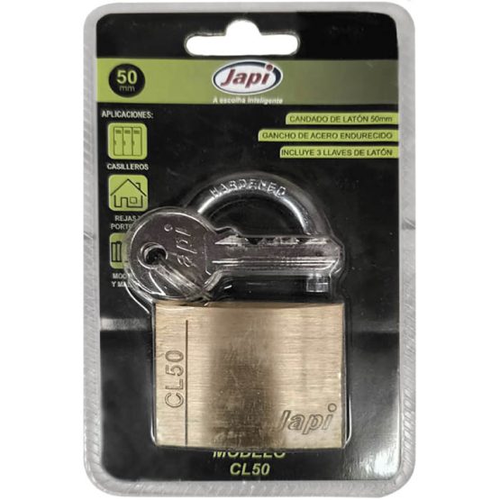 Candado de Latón 50 mm, 3 Llaves, Gancho Endurecido Blister, 3 Llaves